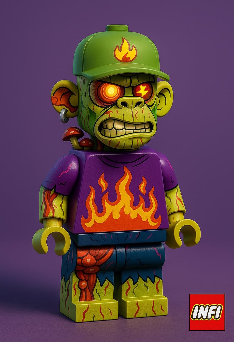 Maintain the authentic LEGO look (studs on heads, classic hand shapes, slight shine on plastic). Create the background in the same color tones as the background of the original character. In the right corner, include a tiny logo very similar to the iconic LEGO logo, saying: INFI.